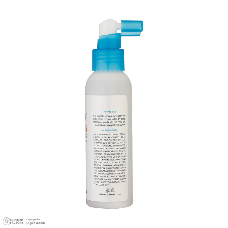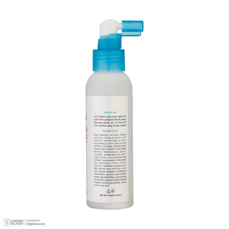 به مدت 6 هفته، روزى یکبار مقدار پنج پاف از محصول را بر روى پوست کف سر اسپرى کنید، به آرامى ماساژ دهید. بعد از مصرف 6 هفته، مصرف را به صورت هفته اى 3 روز و روزى یک مرتبه ادامه دهید.