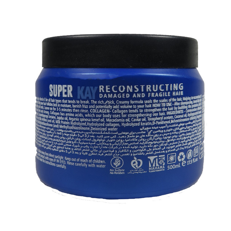 ماسک مو کاسه ای بوتاکس 500 میلی لیتر سوپرکی SUPER KAY غذای تارهای مو بوده و در سرعت بخشیدن به ترمیم بافت مو نقش اساسی دارد. مواد موثر در این محصول موجب تقویت فولیکول های مو شده و به بازسازی سلولی می پردازند. این ماسک مو وز مو را از بین می برد و مانع از گره خوردن تارهای مو می گردد. این محصول به درخشش طبیعی مو افزوده و سلامت آن را تضمین می کند. این محصول به طور کلی مو را نرم می کند و برای افرادی که موهای شکننده و آسیب دیده دارند محصولی ایده آل به شمار می رود.