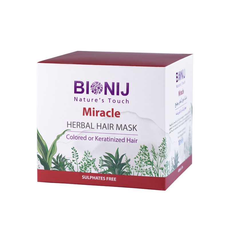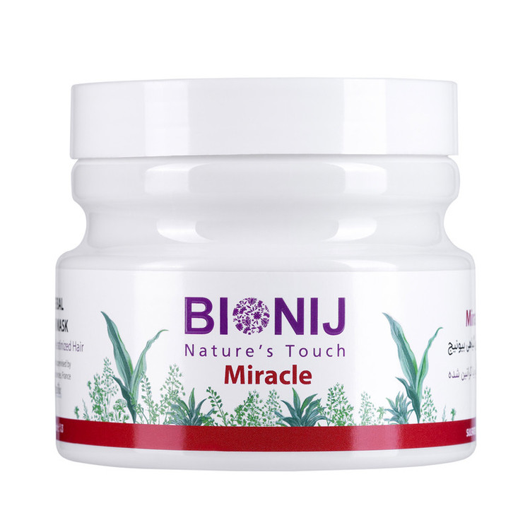 ماسک مو کاسهای مخصوص موهای رنگ شده و کراتینه بیونیج (BIONIJ Miracle)، با فرمولاسیونی بسیار تخصصی و بهرهگیری از ترکیبات طبیعی موثر، آسیبهای ناشی از رنگ، دکلره و کراتینه کردن موها را بهطور عمقی برطرف میکند و موجب حفظ کراتین و افزایش دوام رنگ مو میشود.
