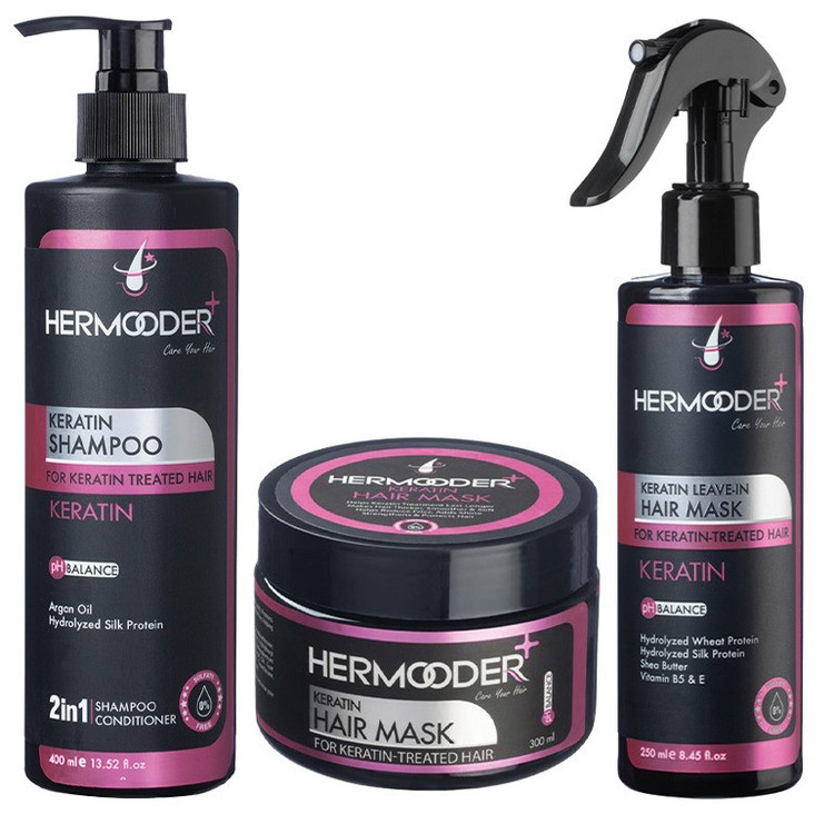 شامپو مو هرمودر مدل Keratin مناسب برای مو کراتین شده حجم 400 میلی لیتر به همراه ماسک مو هرمودر مدل Keratin حجم 300 میلی لیتر و ماسک مو هرمودر مدل Keratin حجم 250 میلی لیتر