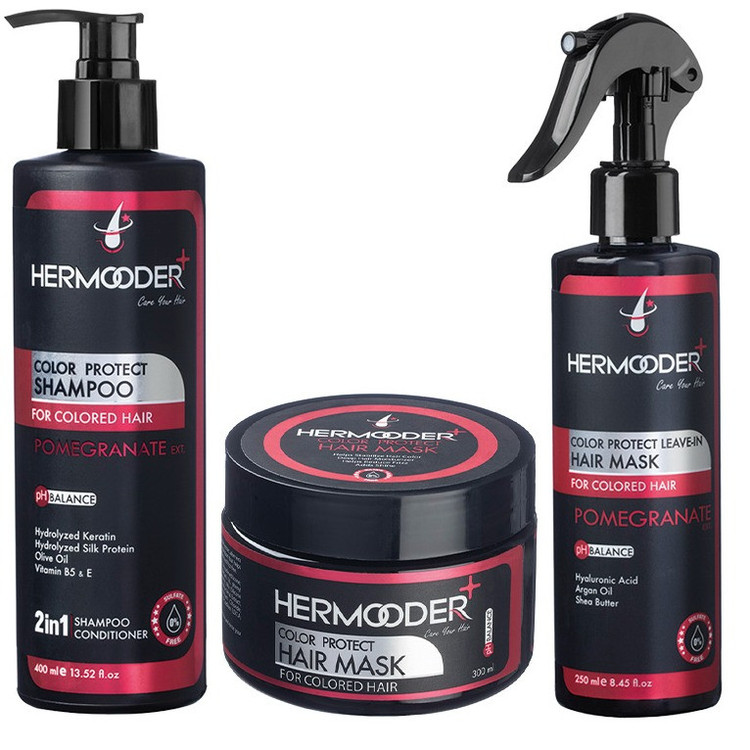 شامپو مو هرمودر مدل Pomegranate Extract مناسب برای موهای رنگ شده حجم 400 میلی لیتر به همراه ماسک مو بدون آبکشی مدل Pomegranate Extract حجم 250 میلی لیتر و ماسک مو با آبکشی مدل Pomegranate Extract حجم 300 میلی لیتر