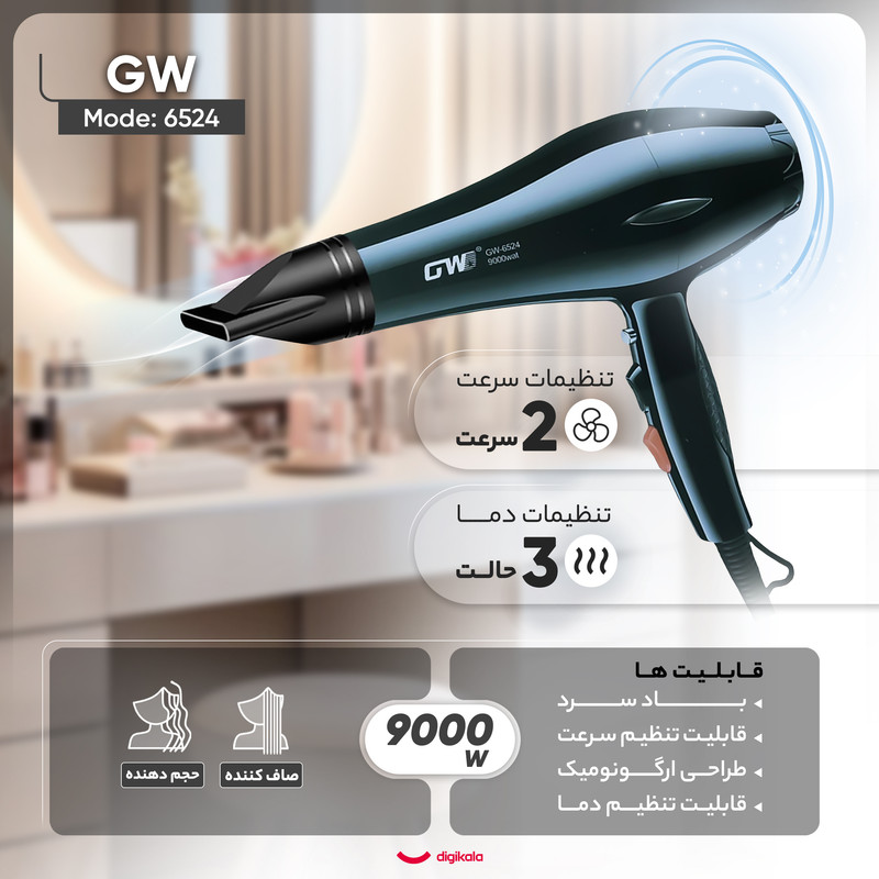 قابلیت تنظیم 3 حالت دما - تنظیم 2 سرعت پرتاب باد - مجهز به کول شات (باد سرد فوری)