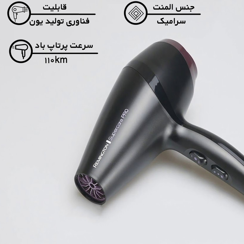 سشوار سالنی سبک و جمع و جور و خشک کردن مو به صورت یکنواخت که آسیبی به مو نخواهد رسید. سرعت پرتاپ باد 110km