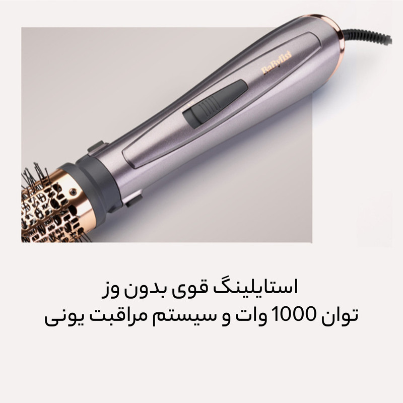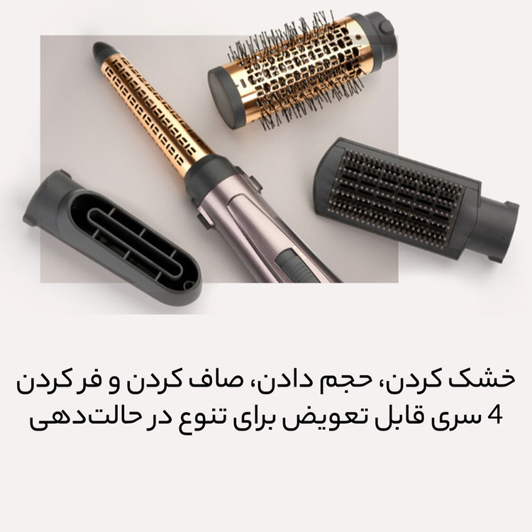 توان مصرفی 1000 وات، دارای سری های: خشک کردن،فر کردن، صاف کردن، حالت دادن، سیستم یون ساز، دو درجه باد گرم یک درجه باد سرد،سایز برس حالت دهنده مو 50 میلی متر،