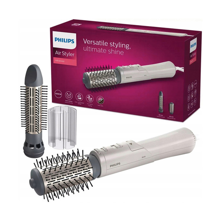 سشوار دارای 2 سر میباشد ( یک سر چرخشی 50 میل و یک سر ثابت 30 میل ) ا- ایونیک - سیم گردان - 1000 وات - چپ گرد و راست گرد - 3 تنظیم سرعت -سرامیک تورمالین -