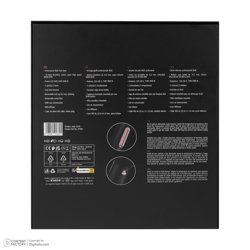 سشوار حرفه ای برند کیپه از لاین HOME PRECISION محصولی پیشرفته، حرفهای و فوقسبک با موتور دیجیتال براشلس (با دور موتور 90000 دور در دقیقه) است که با فناوری یونی طراحی شده و با توان 1500 تا 1800 وات، عملکردی فوقالعاده ارائه میدهد.