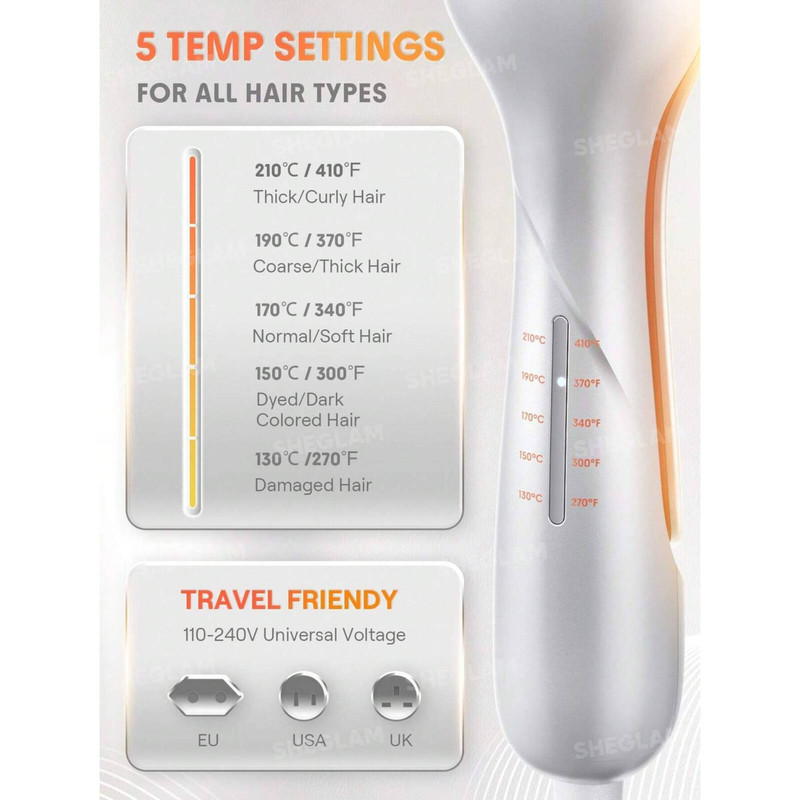 با 5 تنظیم دما و تایمر 7 ثانیهای، میتوانید ظاهر مورد نظر خود را سفارشی کنید. این فر کننده برای انواع موها مناسب است و تایمر هوشمند به شما اطلاع میدهد که استایلتان آماده است.