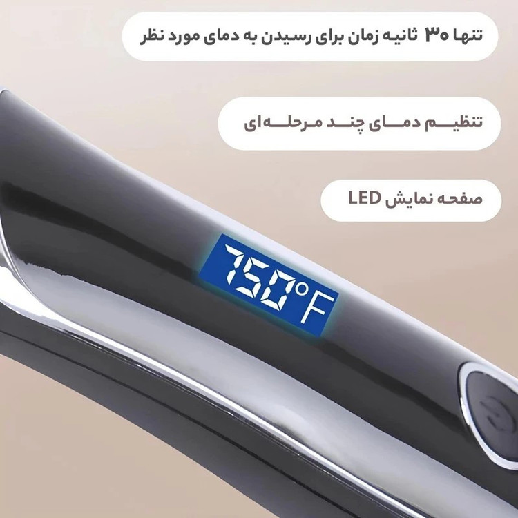 صفحه نمایش دما , سیم گردان ۳۶۰ درجه , مناسب برای موهای خشک و مرطوب , وزن سبک , طراحی ارگونومیک , گرمایش سریع , گرمایش یکنواخت
