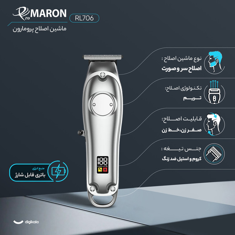 ماشین اصلاح موی سر و صورت پرومارون مدل RL706، اصلاح به صورت تریم، قابلیت اصلاح به صورت صفر، منبع انرژی با باتری قابل شارژ، تکنولوژی اصلاح به صورت صفر زن و خط زن، اندازه اصلاح 2 تا 4