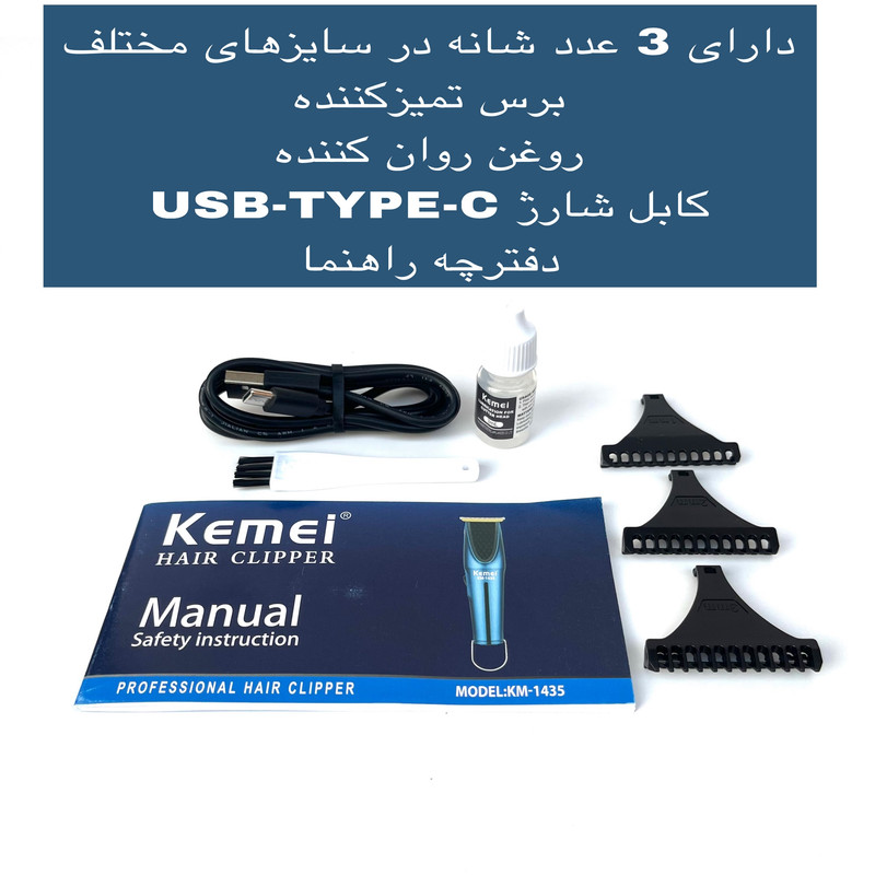 دارای درپوش تیغه-حلقه آویز-3 عدد شانه در سایزهای مختلف-برس تمیز کننده-روغن-چراغ نشانگر شارژ-