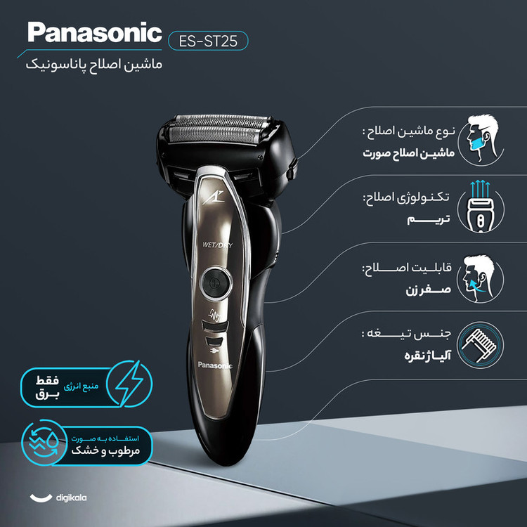 سری این ماشین اصلاح یک سنسور دارد که با توجه به حجم موها در نقاط مختلف صورت، میزان قدرت موتور را کاهش یا افزایش میدهد. با توجه به این ویژگی، فرد فشار کمتری را روی پوست احساس کرده و در نتیجه میزان آسیب به پوست کاهش مییابد. ماشین اصلاح ES-ST25 ساخت شرکت «پاناسونیک» (Panasonic)دارای سری برش مستقیم است که به کوتاهکردن موهای صورت با مرزبندی مشخص کمک میکند. با وجود قابلیت استفاده زیر دوش، موهای صورت را راحتتر میتوان کوتاه کرد. این محصول تیغههایی از جنس آلیاژ نقره دارد که موهای صورت را بهطور کامل کوتاه میکنند. همچنین با استفاده از سری خطزن میتوان فرمهای مختلفی به موهای صورت داد. ES-ST25 سریهای قابلشستوشو دارد که در صورت کثیفشدن، میتوان آنها را شست. برای استفاده از این محصول باید باتریهای آن را به مدت 60 دقیقه شارژ کرد که در مقایسه با مدلهای مشابه زمان کوتاهی است. همچنین مدتزمان شارژدهی این ماشین اصلاح 45 دقیقه است. طراحی ارگونومیک ES-ST25 نیز دردستگرفتن آن را راحتتر میکند. از دیگر ویژگیهای این ماشین اصلاح میتوان به تیغههایی از جنس آلیاژ نقره اشاره کرد. تیغههایی از جنس آلیاژ نقره مانع از خوردگی در هوای مرطوب میشود و به ماندگاری دستگاه میافزاید. ES-ST25 دارای تیغههای از جنس آلیاژ نقره، سری خطزن، قابلیت ضدآب، مدتزمان شارژ 60 دقیقه و طراحی ارگونومیک است.