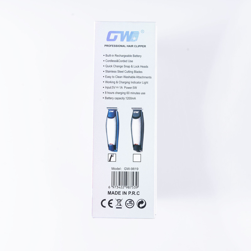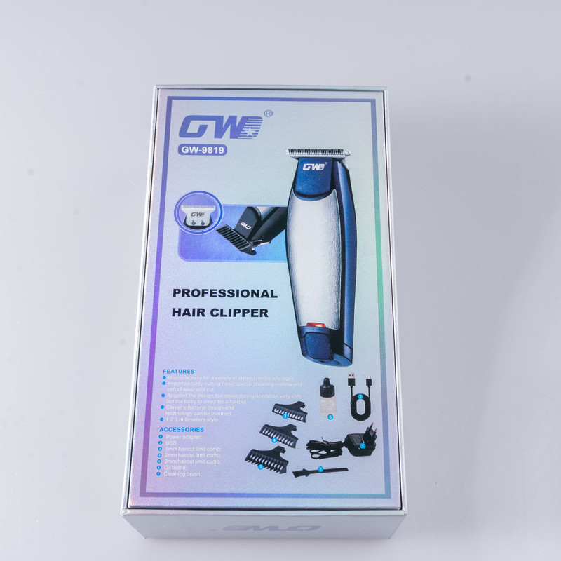ماشین اصلاح موی سر و صورت شارژی جی دبلیو مدل G-9819، اصلاح به صورت خط زن و صفر زن، منبع انرژی با برق و باتری، تکنولوژی اصلاح به صورت تریمر، اندازه اصلاح 0.1 میلیمتر، مدت زمان شارژ 480 دقیقه و مدت زمان استفاده پس از شارژ 60 دقیقه، به همراه شارژر و روغن
