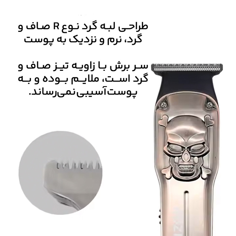 ماشین اصلاح بو صورت خط زن کاربرد دارد و ماشین دارای باتری لیتیومی ،طرح جمجمه،دکمه رو شن و خاموش دارد.