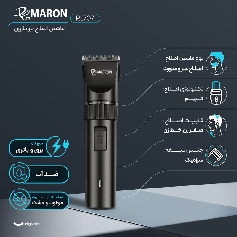 سایر مشخصات : دارای 2 باطری 2000 میلی آمپر سوپر لیتیوم ، قابلیت تیغه تنظیم اصلاح ، قابلیت جداسازی تیغه ، دارای برس نظافت ، دارای 4 عدد سری