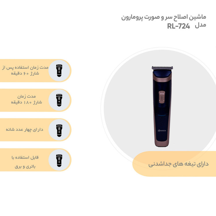 - قابل استفاده با باتری و برق - تیغه های جداشدنی - هر 3 ساعت شارژ، 45 دقیقه استفاده- برس تمیز کاری و روغن برای روغنکاری تیغه ها