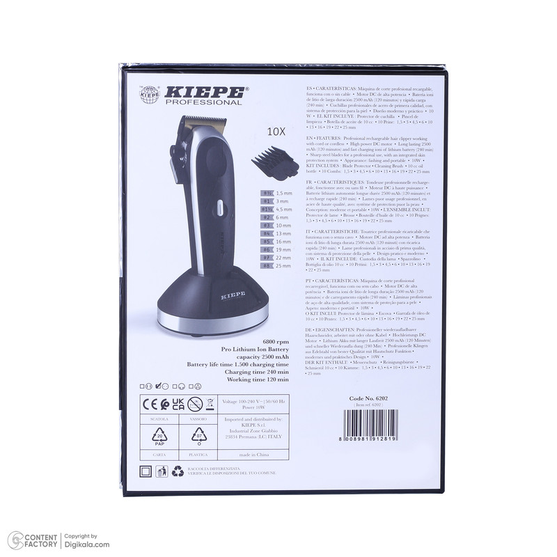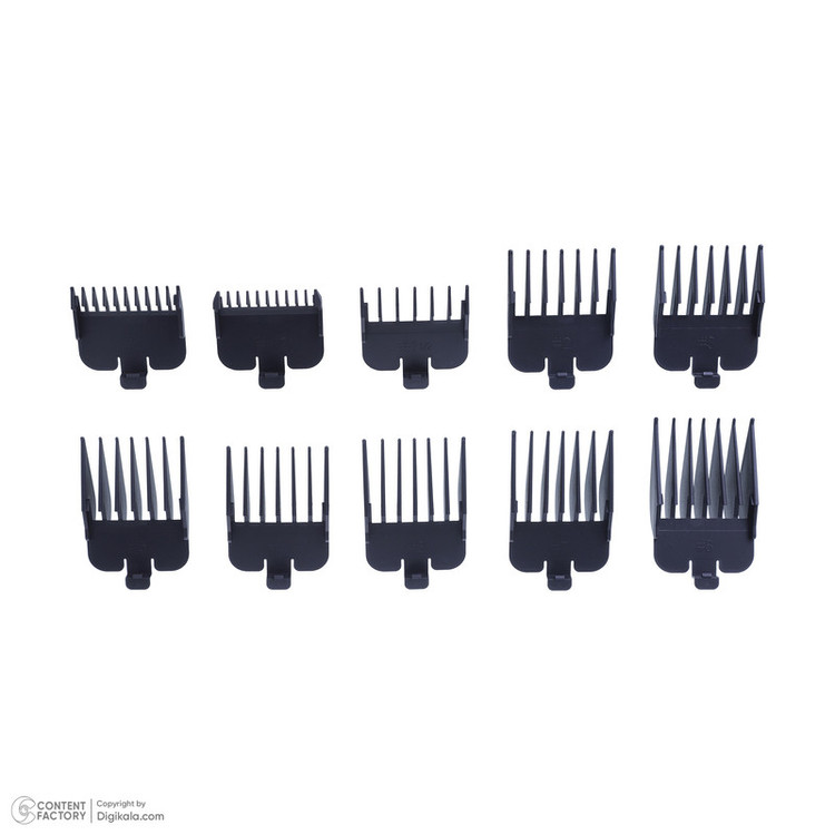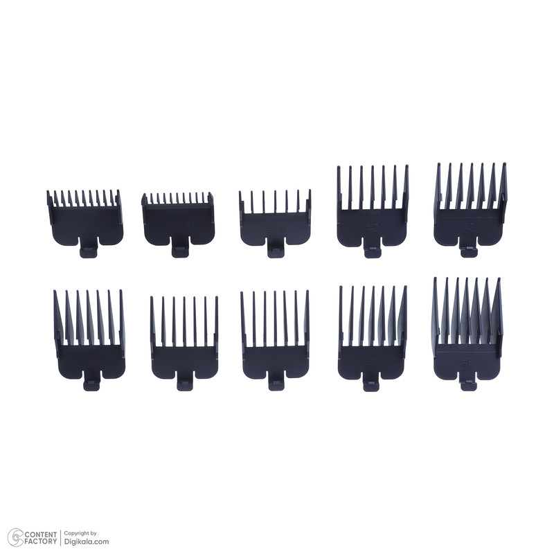 10 عدد شانه - پیچ گوشتی -روغن - محافط تیغه - استند شارژ - گیره مو - برس تمیزکننده