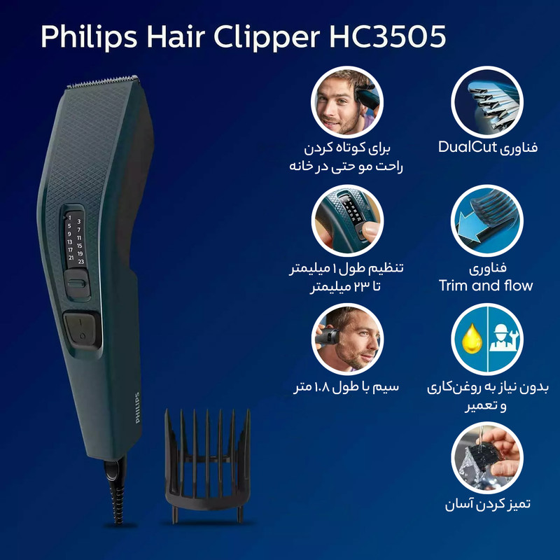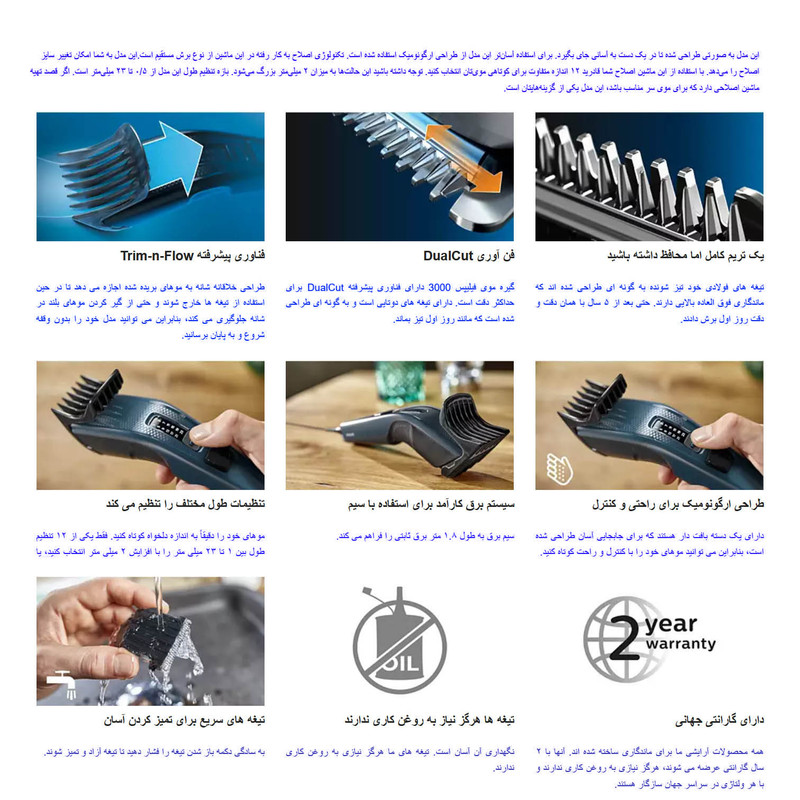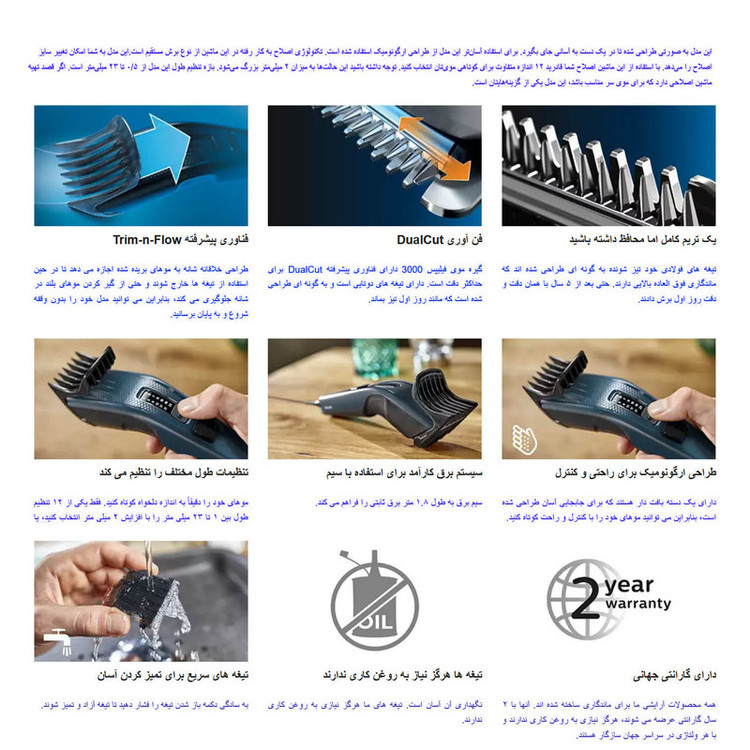 ساخت اندونزی - موتور قدرتمند با طول عمر بالا - شانه دستگاه در 12 اندازه مختلف (1 و 3 و 5 و 7 و..... و 23) قابل تنظیم میباشد و اندازه اصلاح بدون شانه نیم میلی متر میباشد