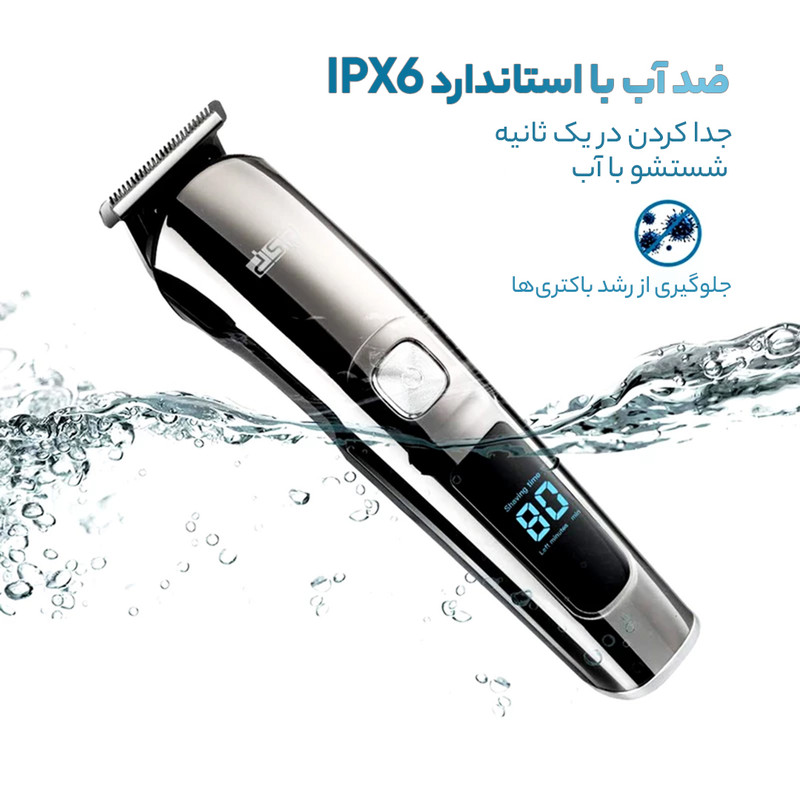 استاندارد ضد آب IPX6، دارای 6 سری قابل تعویض، دارای استند جهت نظم قرارگیری ماشین اصلاح و سری ها