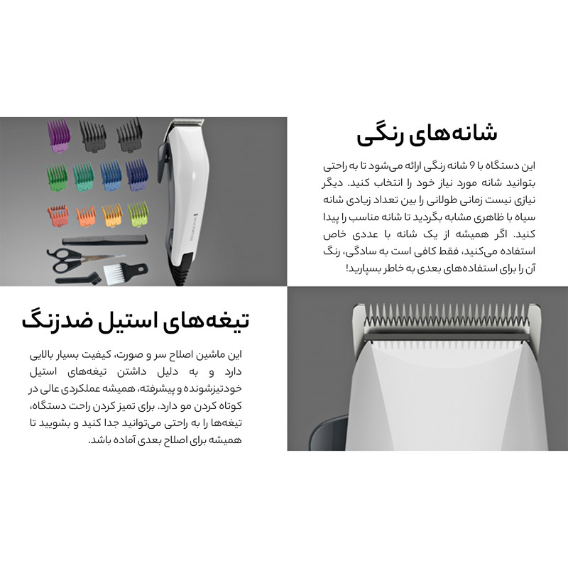 - برس گردن، قیچی و شانه - دارای سری قابل جداسازی جهت تمیز کردن - دارای 9 شانه با رنگهای مختلف برای کوتاه کردن موهای صورت و سر در اندازههای 1.5 تا 25 میلیمتر