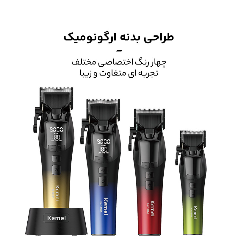 طراحی ارگونومیک بدنه و وزن مناسب دستگاه باعث شده است که حتی در استفاده طولانیمدت نیز دست دچار خستگی نشود. ظاهر مدرن و جذاب KM-1858A نیز آن را به گزینهای محبوب برای افرادی تبدیل کرده که علاوه بر کیفیت، به زیبایی ابزارهای شخصی خود اهمیت میدهند. در مجموع، این مدل با ترکیب قدرت موتور، کیفیت تیغهها، باتری بادوام و طراحی کاربرپسند، یکی از بهترین انتخابها در دسته ماشینهای اصلاح موی سر و صورت محسوب میشود.