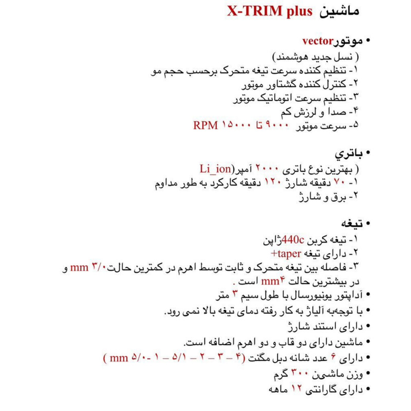آداپتور یونیورسال با سیم 3 متری با توجه به آلیاژ به کار رفته در تیغه دما بالا نمی رود دارای استند شارژ دارای دو قاب و دو اهرم اضافه دارای 6 شانه دبل مگنت 0/5، 1، 1/5، 2، 3، 4 میلی متر