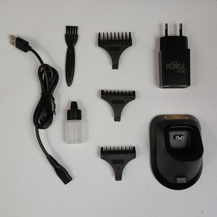 2 عدد شانه اضافه + روغن + برس تمیز کننده + اداپتور + کابل شارژ + استند شارژ