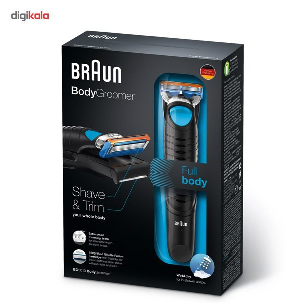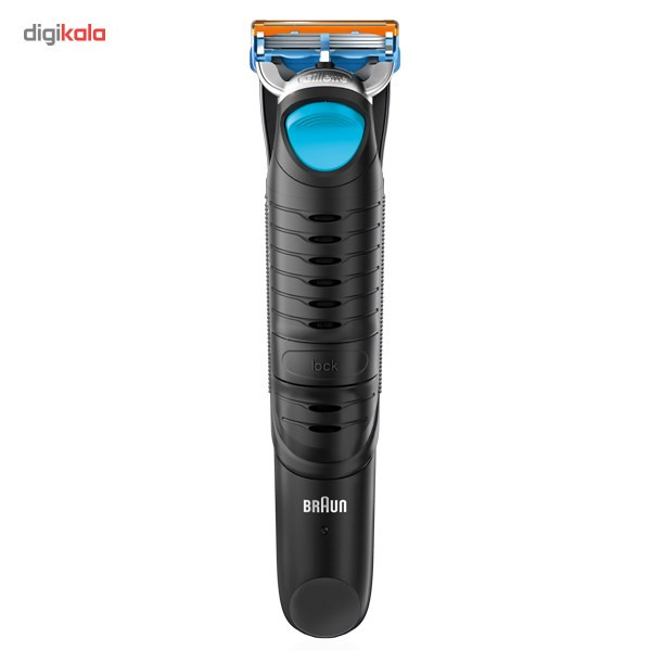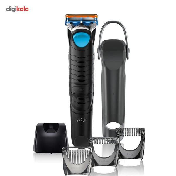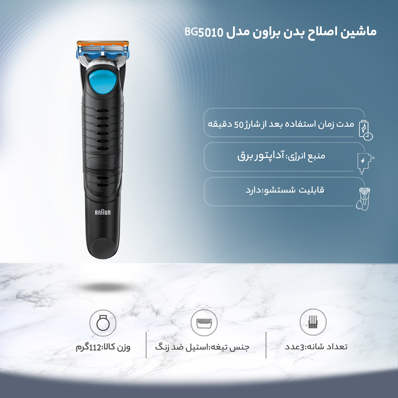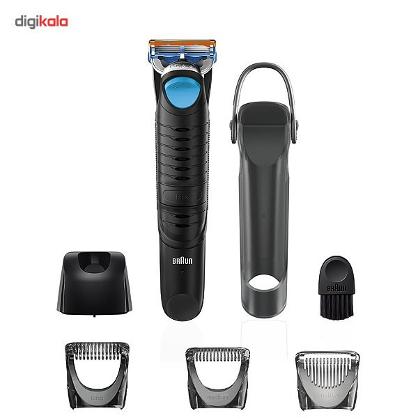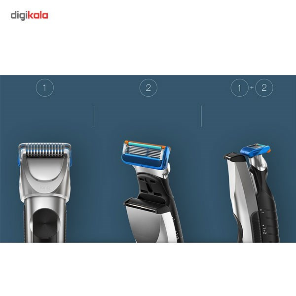 سه عدد شانهی قابل نصب روی خطزن برای اصلاح موها با طولهای 0.6، 3 و 8 میلیمتردارای تیغ ژیلت 5 لبه برای اصلاح از تهطراحی ارگونومیکمدت زمان شارژ کامل باتری: 14 ساعتمدت زمان شارژدهی: 50 دقیقهنشانگر باتریکاملا ضدآب- وزن: 112 گرم- ابعاد: 6.2 × 15.5 × 22.2