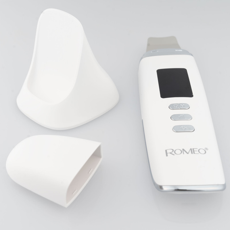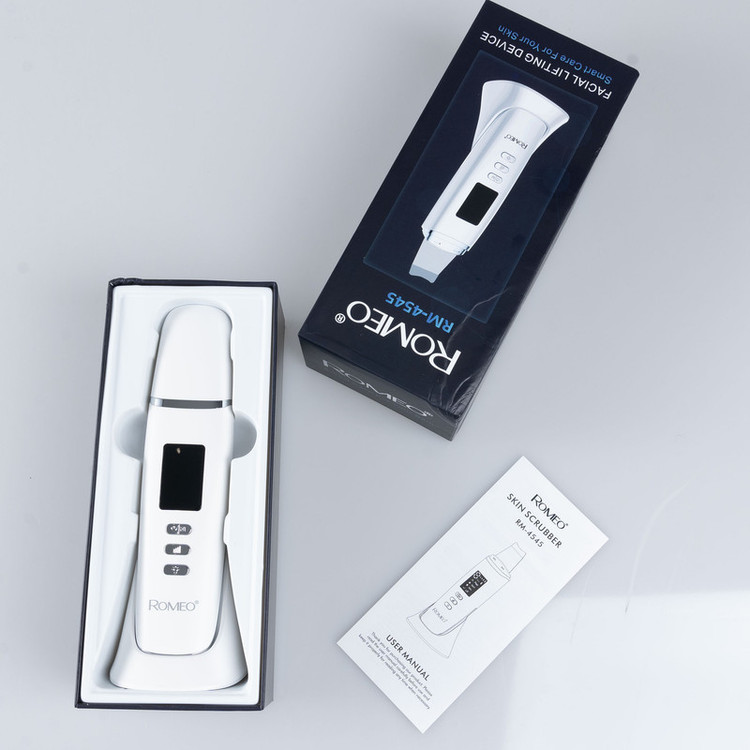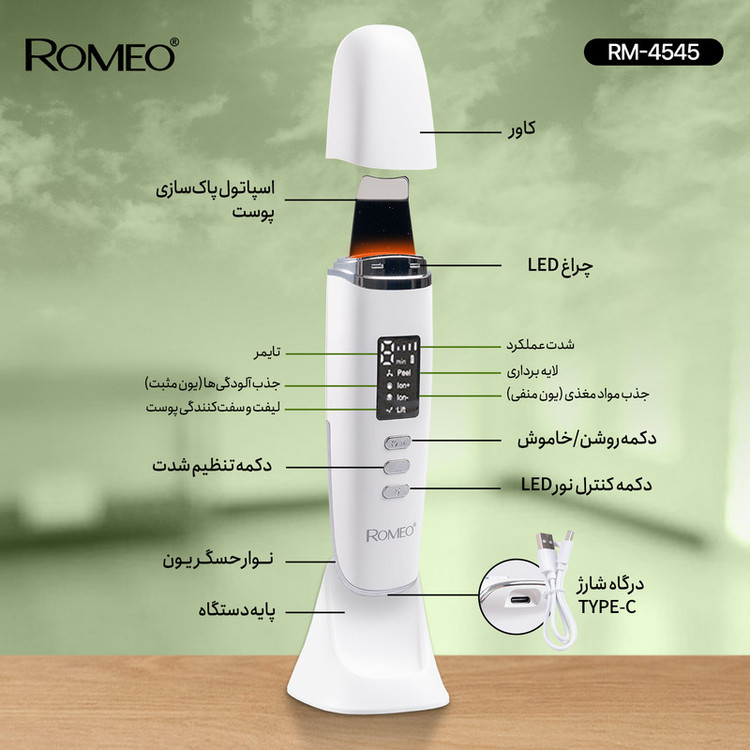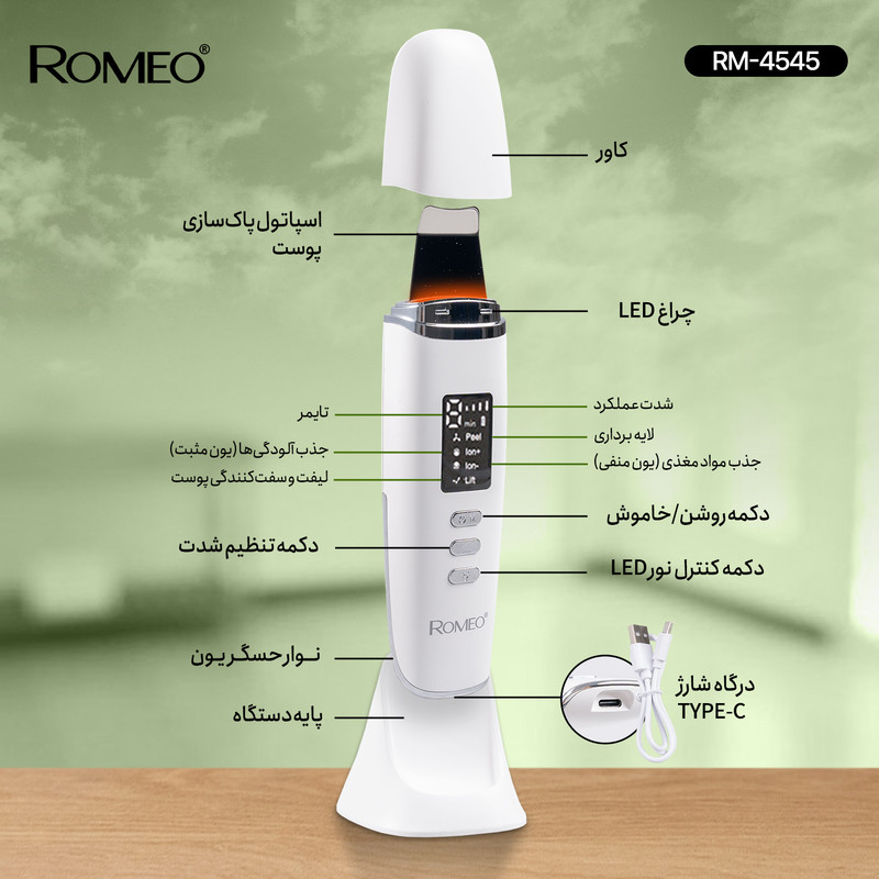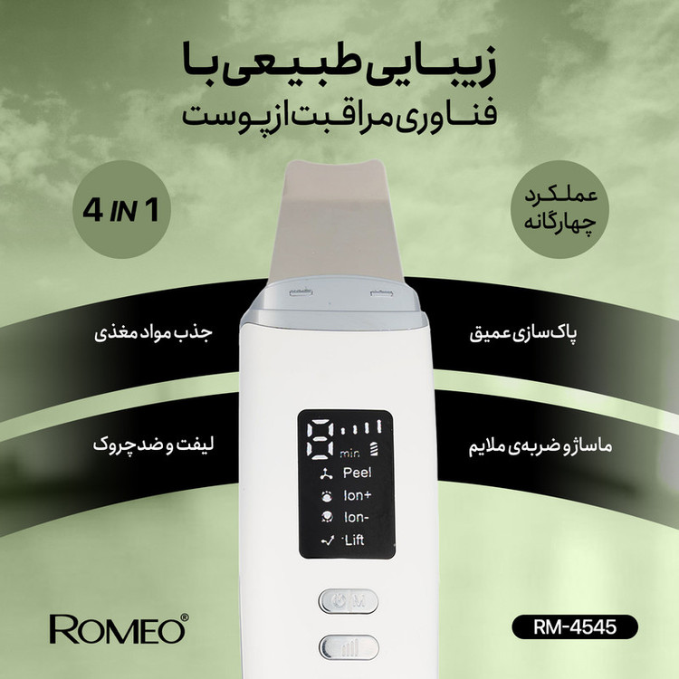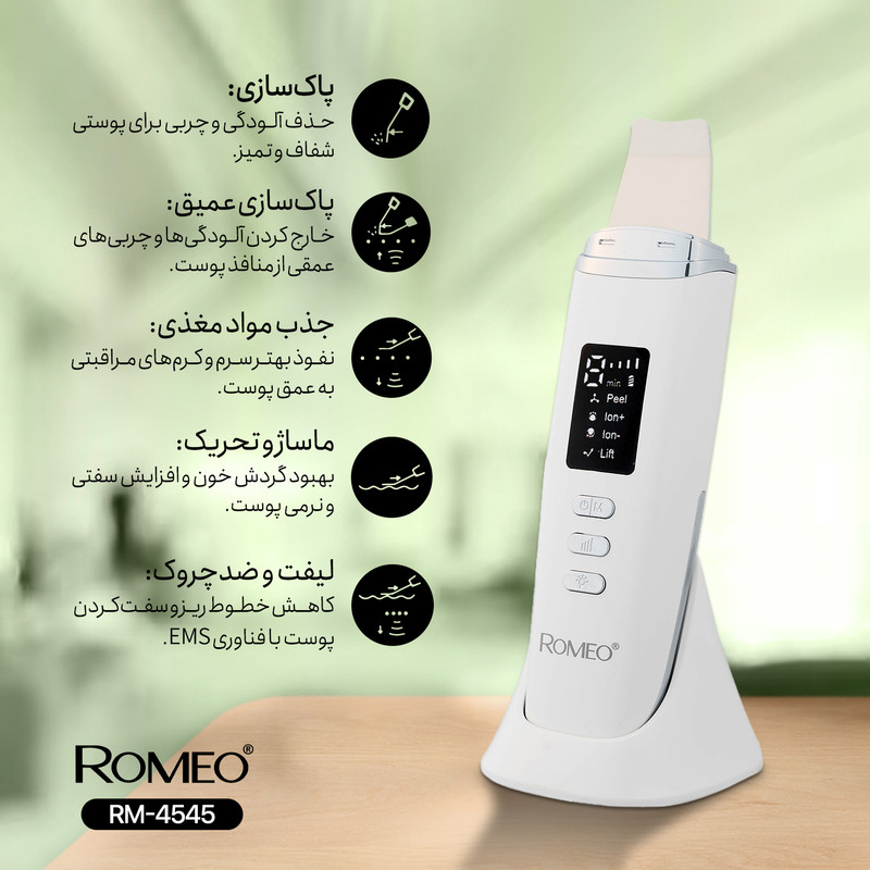 دستگاه پاکسازی و لیفتینگ پوست ROMEO RM-4545 یک اسکرابر حرفهای و پیشرفته است که با ترکیب فناوریهای اولتراسونیک، یونتراپی مثبت و منفی، ماساژ و میکروویبره طراحی شده تا یک روتین کامل مراقبت از پوست را در اختیار شما قرار دهد. این دستگاه با تولید لرزشهای اولتراسونیک، بهصورت مؤثر چربی اضافه، آلودگیها و سلولهای مرده را از سطح پوست جدا میکند و باعث روشنتر شدن و افزایش شفافیت پوست میشود. در حالت یون مثبت (Ion+)، دستگاه کمک میکند آلودگیهای عمقی، جوشهای سرسیاه و چربیهای تجمعکرده از منافذ خارج شوند و پاکسازی واقعی صورت بگیرد. حالت یون منفی (Ion–)، سرمها و مواد مراقبتی را به عمق پوست هدایت میکند تا جذب فوقالعاده سریعتری داشته باشند و پوست تغذیه و آبرسانی مؤثرتری دریافت کند.