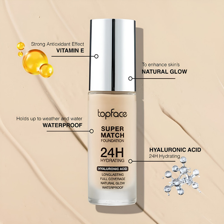 کد رنگ 001 Ivory Nude فول کاور حاوی ویتامین E و اثر آنتی اکسیدانی قوی اثر درخشش طبیعی و تقویت پوست ضد آب و تحمل شرایط سخت آب و هوایی حاوی هیالورونیک اسید و آبرسانی 24 ساعته پوست