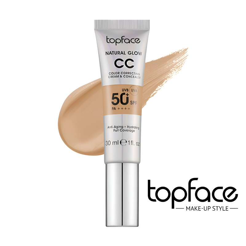 کرم پودر CC مایع +SPF50 تاپ فیس مدل NATURAL GLOW شماره 008 مناسب برای انواع پوست حجم 30 میلی لیتر
