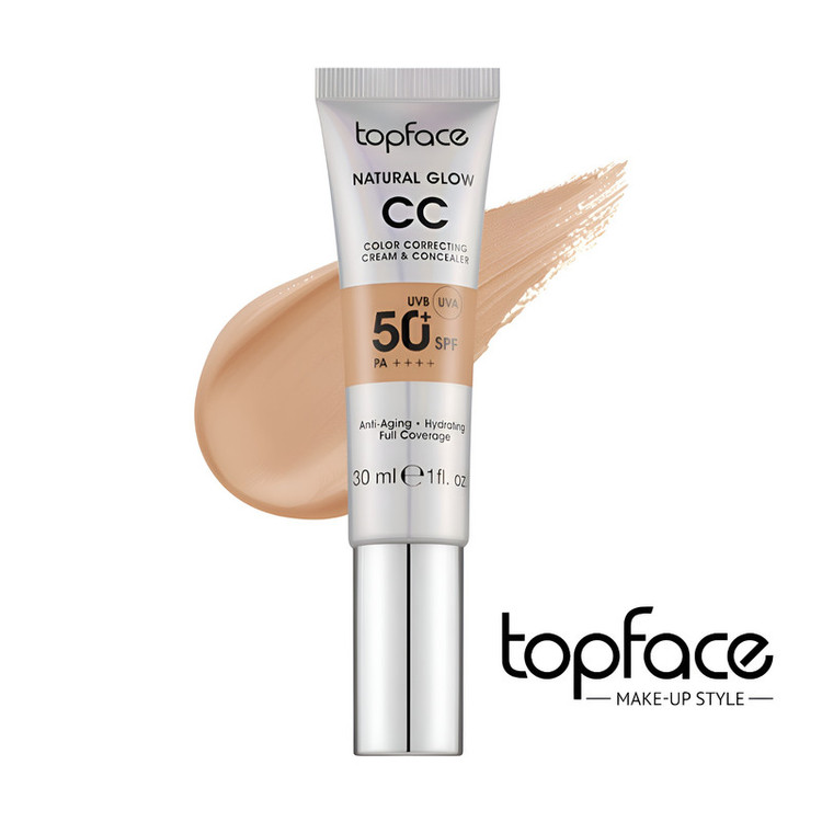کرم پودر CC مایع +SPF50 تاپ فیس مدل NATURAL GLOW شماره 007 مناسب برای انواع پوست حجم 30 میلی لیتر