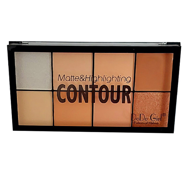 برای کانتور کردن از رنگ 2-3 درجه تیره تر از رنگ کرم پودر و برای هایلایت از 2-3 درجه روشن تر از کرم پودر استفاده میشود. انتخاب رنگ در کانتور و فید یا محو کردن مرزها و خطوط بسیار مهم است. برای این کار ابتدا باید فرم صورت فرد را بشناسید و سپس به کانتور کردن آن بپردازید. مثلا در کانتور صورت های کشیده، هرگز نباید از خطوط رو به پایین استفاده کرد؛ زیرا چهره را کشیده تر نشان خواهد داد، بلکه باید از زیر استخوان گونه به صورت مورب و رو به پایین به اندازه سه انگشت مانده به بینی خطی، صاف و به صورت نیم هلال رو به بالا کشید و به خوبی محو کرد تا صورت گرد تر دیده شود. در کانتور صورت های تپل، کشیدن هر خط صاف ممنوع است و باید از زیر استخوان گونه به صورت مورب و رو به پایین 2-3 انگشت مانده به لبها و از قسمت پایین گوش تا گوش دیگر خطی به اندازه یک سانت بکشید و اگر غبغب دارید زیر آن را هم کانتور کنید. پالت هایلایتر و کانتور 8 رنگ دودوگرل شماره 01 دارای هشت رنگ برای کانتور هایلایتر میباشد که مناسب انواع رنگ پوست است. از رنگ تیره برای کوچک کردن و از رنگ روشن برای برجسته سازی استفاده میکنیم. بافت نرم و پودری آن به راحتی روی پوست مینشیند و پیگمنت های بالای آن تمام عیوب پوست را به خوبی میپوشاند و ماندگاری خوبی روی پوست دارد. ضد حساسیت است. از این پالت میتوان به عنوان رژگونه ، برنزر و سایه هم استفاده کرد.