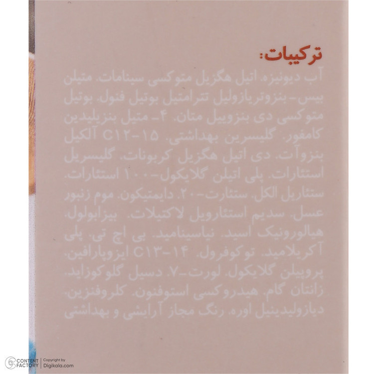 ویژگیهای ضدآفتاب : محافظت کننده در برابر اشعه UVA , محافظت کننده در برابر اشعه UVB , فاقد پارابن , فاقد سیلیکون