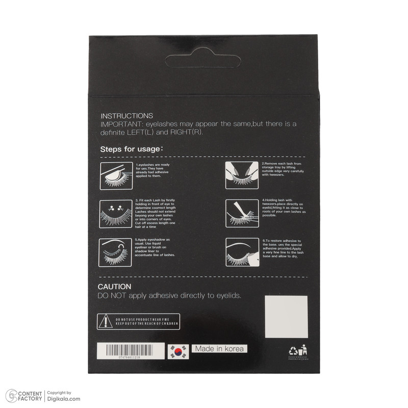 مژه را بهآرامی از بسته جدا کنید. مژه را روی پلک قرار داده و اندازه آن را با چشم تنظیم کنید. مقدار مناسبی چسب مژه به نوار بزنید و چند ثانیه صبر کنید. مژه را از وسط روی خط مژه قرار داده و دو سر آن را فیکس کنید.