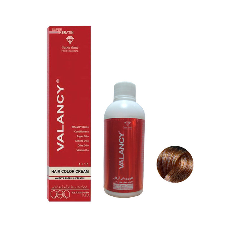 کیت رنگ مو والنسی حاوی کراتین، ویتامین C، پروتئین گندم، نرم کننده و روغن زیتون، بادام و آرگان می باشد،این محصول قابلیت ترکیب آسان با اکسیدان همراهش را جهــت دستیابی به کرمی صاف ، نرم و یکنواخت دارد.