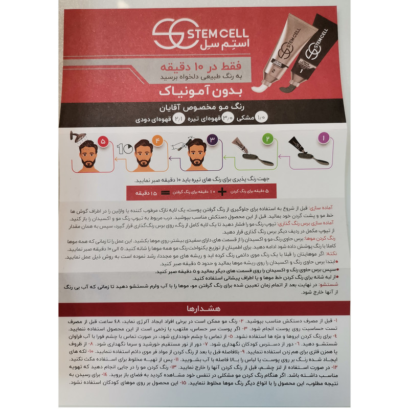 رنگ مو و ریش استم سل(Stem Cell)مخصوص آقایان ( قهوه ای دودی شماره2.1) با فرمولاسیون تخصصی و حذف مواد مضر همچون آمونیاک،اکسیدها و ...یک از حرفه ای ترین رنگ موها به حساب می آید که یک رنگ کاملآ طبیعی و شیک به موها می بخشد.در واقع روغن آرگان،عصاره جوانه گندم،کراتین،روغن بادام،روغن زیتون،روغن آفتاب گردان،روغن ماکادمیا از ترکیبات گیاهی و مغذی این رنگ موی استم سل (Stem Cell)به حساب می آید لذا با هر نوع مویی سازگار بوده که همزمان با رنگ کردن موها،جلا و طراوت خاصی به موها می بخشد که وجود مواد مغذی و نرم کننده در رنگ موی استم سل مانع زبری و خشکی موها میشود.همچنین در رنگ موی استم سل (Stem Cell)حذف کامل آمونیاک و دیگر ترکیبات آسیب زننده(عوامل خشکی و کدری مو،سوزش چشم،تنگی نفس و سرطان) باعث برتری آن نسبت به بسیاری از رنگ موها شده است لذا رنگ موهای استم سل(Stem Cell)را میتوان جزو بی ضررترین رنگ موها در نظر گرفت که از کراتین مو محافظت میکند.در ضمن استفاده از رنگ مو و ریش استم سل(Stem Cell) به راحتی و برا هر فردی حتی در خانه امکان پذیر است و فقط 10 دقیقه زمان لازمه تا کل موها،حتی موهای سفید را پوشش دهد.