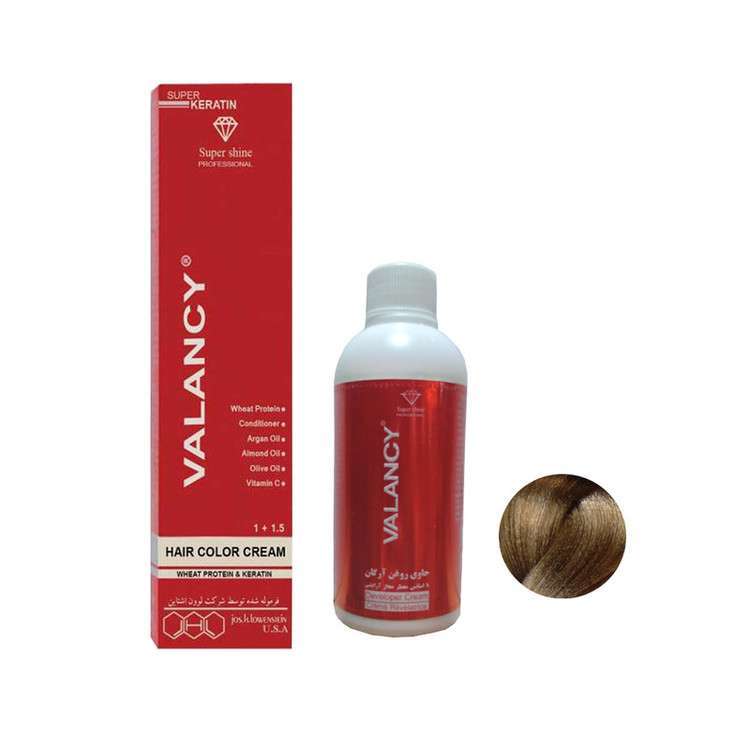 کیت رنگ مو والنسی حاوی کراتین، ویتامین C، پروتئین گندم، نرم کننده و روغن زیتون، بادام و آرگان می باشد،این محصول قابلیت ترکیب آسان با اکسیدان همراهش را جهــت دستیابی به کرمی صاف ، نرم و یکنواخت دارد.