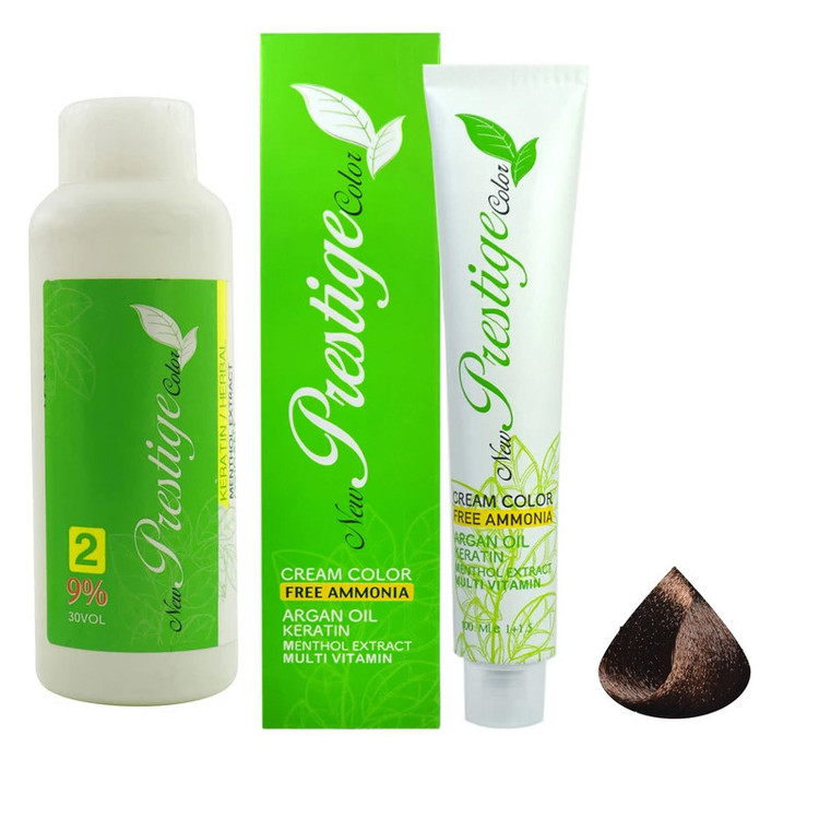 رنگ مو نیو پرستیژ کالر شماره P4 حجم 100 میلی لیتر رنگ شکلاتی سولید به همراه اکسیدان نیو پرستیژ کالر مدل 2 نه درصدی حجم 150 میلی لیتر