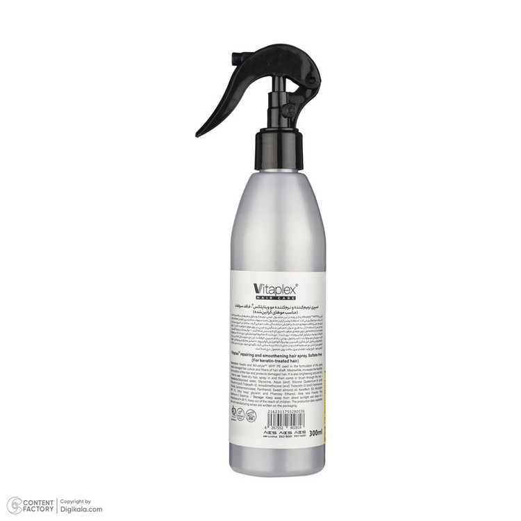 این اسپری مو حاوی روغن بادام شیرین، پودر برگ آلوئهورا و گلیسیرین است. پس از استفاده از محصول، موها نیاز به آبکشی ندارند.