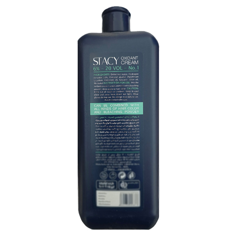 اکسیدان 6 درصد نمره یک استیسی 900 میلی لیتر در حجم کم و مخصوص رنگ کردن خانگی مو تولید میشوند. در تولید این اکسیدانها از گلسترین و روغن زیتون استفاده میشود که علاوه بر کم رنگ کردن رنگدانهها، باعث تقویت فولیکولهای مو نیز میشوند. به علاوه این اکسیدانها حاوی ویتامین E هستند که نقش زیادی در درخشندگی و استحکام موها دارد