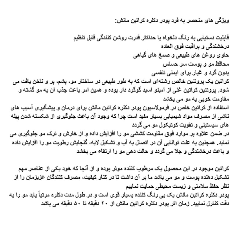 این پودر دکلره کراتینه با قدرت بیرنگکنندگی بالا، حتی برای موهای مقاوم و موهایی که دیر بیرنگ میشوند مناسب است و با خاصیت محافظت از مو و پوست سر حساس طراحی شده است. فرمولاسیون محصول حاوی کراتین و ترکیبات محافظ بوده که به پیشگیری از آسیبهای ناشی از مواد شیمیایی، حفظ ساختار مو و افزایش مقاومت کششی تارهای مو کمک میکند. این محصول علاوه بر روشنکنندگی مؤثر، باعث افزایش نرمی، لطافت و درخشندگی مو شده و از خشکی و شکنندگی بیش از حد جلوگیری میکند. وجود روغنها و ترکیبات نرمکننده در فرمول آن به محافظت بهتر از مو در حین دکلره کمک میکند. این پودر دکلره فاقد گرد و غبار اضافی بوده و با فرمول جدید ارائهشده در بروشور محصول، امکان بیرنگ کردن موها را بهراحتی فراهم میکند و برای استفاده حرفهای و شخصی گزینهای مناسب است.