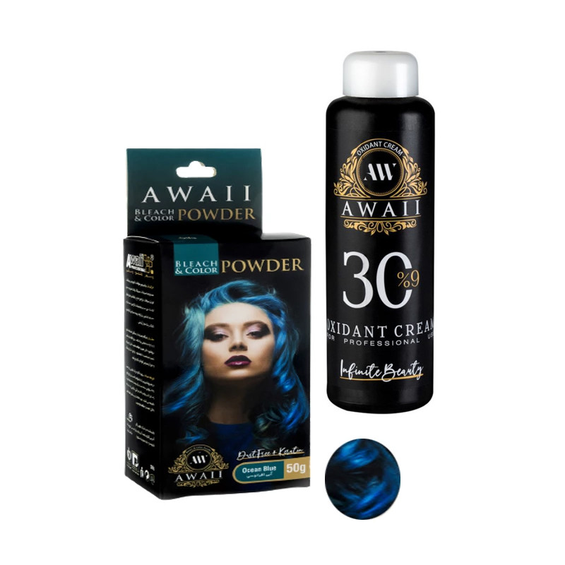 پودر دکلره آوایی مدل کراتین وزن 50 گرم رنگ آبی اقیانوسی به همراه اکسیدان مدل 30vol نه درصدی حجم 180 میلی لیتر
