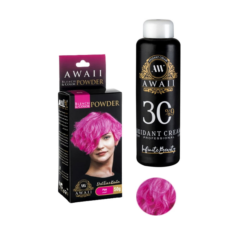پودر دکلره آوایی مدل کراتین وزن 50 گرم رنگ صورتی به همراه اکسیدان مدل 30vol نه درصدی حجم 180 میلی لیتر