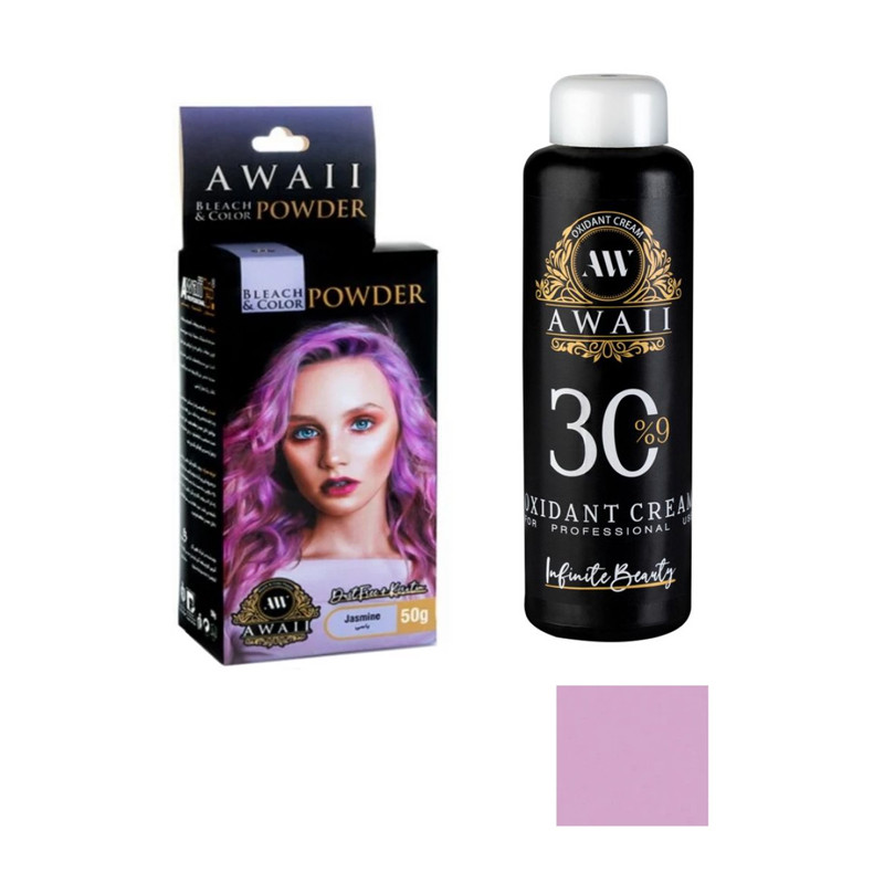 پودر دکلره آوایی مدل کراتین وزن 50 گرم رنگ یاسی به همراه اکسیدان مدل 30vol نه درصدی حجم 180 میلی لیتر