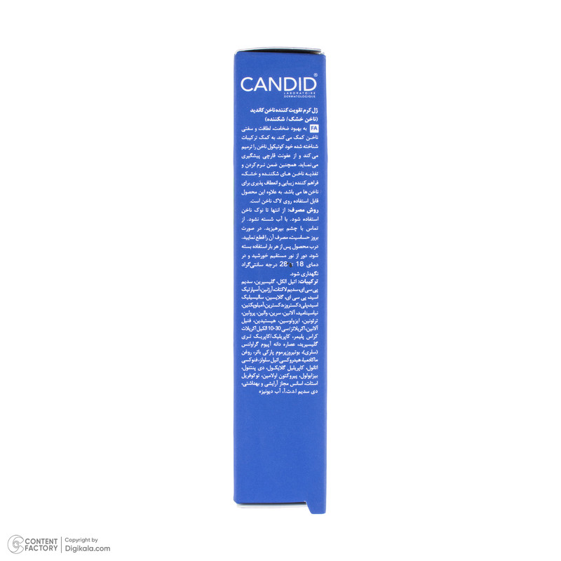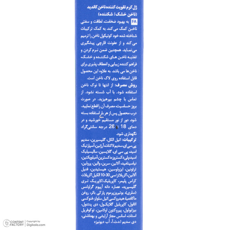 ژل کرم تقویت کننده ناخن کاندید محصولی مناسب برای بهبود ضخامت، لطافت و سفتی ناخن می باشد. این محصول حاوی گلیسیرین، سالیسیلیک اسید، عصاره دانه آپیوم گراولنس، روغن ماکادمیا بوده که موجب ترمیم کوتیکول ناخن می شود و ناخن ها را تغذیه می کند.