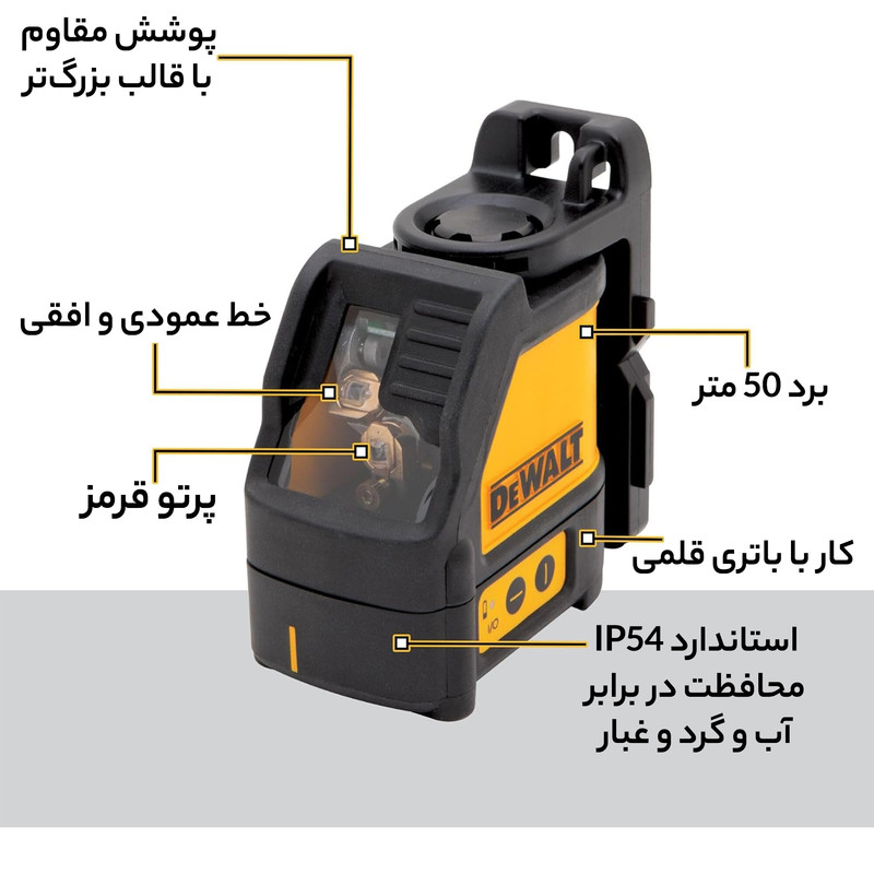 باتری , دارای سیستم تراز خودکار , قابلیت نصب روی پایه , نمایش خط لیزر افقی , نمایش خط لیزر عمودی