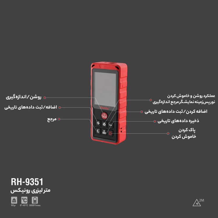 Class 2 , باتری نیمقلمی , صفحه نمایش 4خطی , قابلیت اندازهگیری حجم , قابلیت اندازهگیری زاویه , قابلیت اندازهگیری فاصله , قابلیت اندازهگیری مساحت , قابلیت خاموش شدن خودکار , واحد اندازهگیری اینچ , واحد اندازهگیری فوت , واحد اندازهگیری متر