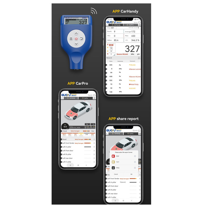 ضخامت سنج پوشش رنگ تستر خودرو GUOOU GC8102 برای تستر آسیب خودرو و کارشناسی رنگ خودرو و دیگر صنایع مرتبط با اندازه گیری رنگ طراحی شده است .