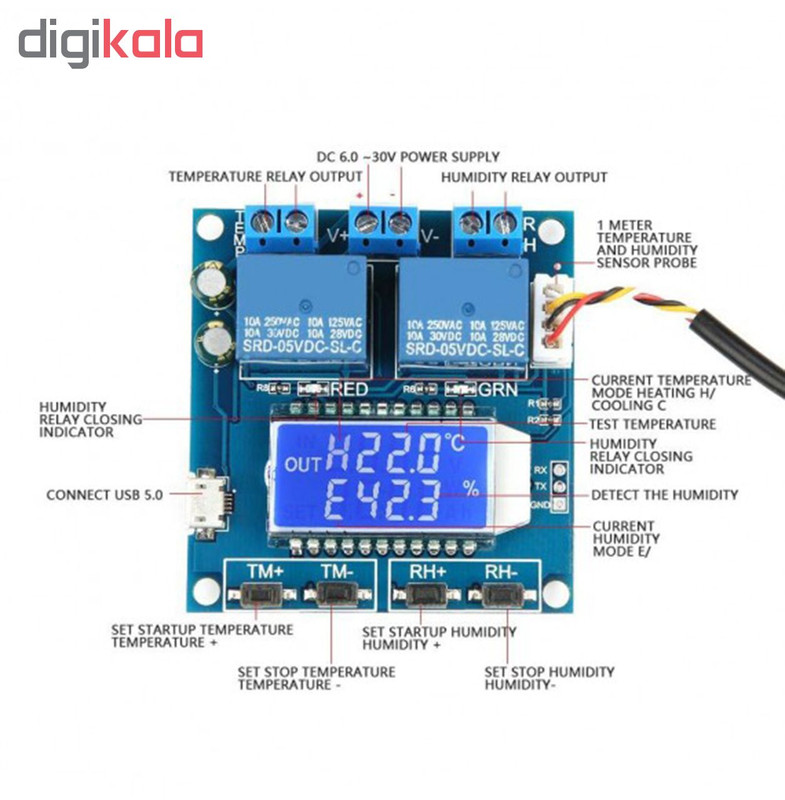 XY-TR01 ماژول کنترل دما و رطوبت با دقتی بالا و صفحه نمایش دیجیتال که هر دو خروجی دما و رطوبت را به صورت همزمان نشان میدهد. این محصول با سنسور SHT20 کار میکند که از صنعتی ترین سنسور های حال حاضر بازار است. عملکرد دستگاه به دو بخش دما و رطوبت تقسیم بندی می شود.