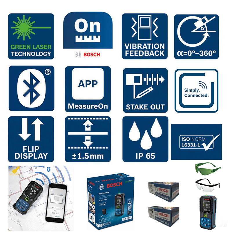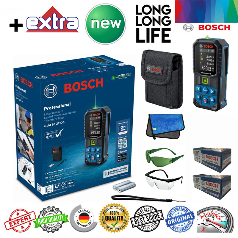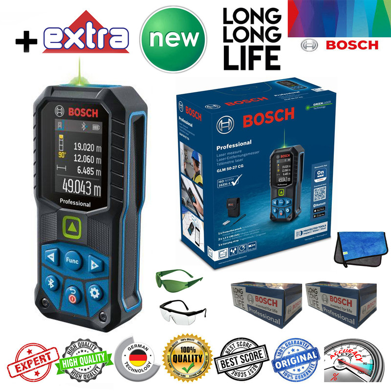 یک عدد عینک لیزری سبز UV400 بوش / یک عدد عینک ایمنی مهندسی بوش / یک عدد دستمال تنظیف بوش مدل میکروفایبر تام کلین / دو عدد باتری / یک عدد کیف و بند